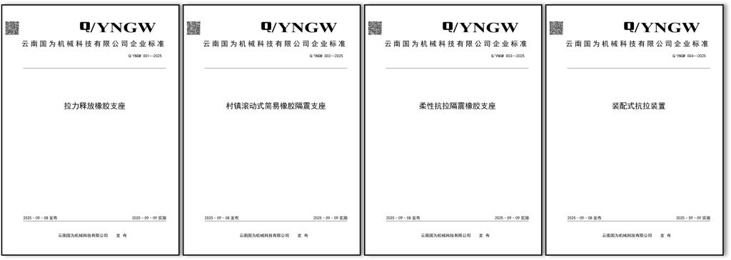 2025年9月8日,《拉力释放橡胶支座》(Q/YNGW 001-2025)、《村镇滚动式简易橡胶隔震支座》(Q/YNGW 002-2025)、《柔性抗拉隔震橡胶支座》(Q/YNGW 003-2025)、《装配式抗拉装置》(Q/YNGW 004-2025)四项企业标准正式发布,并于9月9日起全面实施。