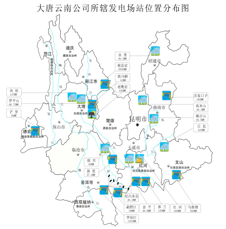 大唐云南发电有限公司(以下简称云南公司)是大唐集团公司的全资子公司,前身为中国大唐集团有限公司云南分公司,成立于2006年12月23日,2015年7月13日由分公司改为子公司。公司生产调度指挥中心位为云南省昆明市广福路南悦城A栋,总资产约500亿元,项目分布在昆明、曲靖、丽江、普洱、红河、文山、大理、玉溪、昭通、德宏、迪庆等11个地州,目前在役装机675.412万千瓦涵盖水火风光电源项目,以清洁能源为主具有较强的竞争优势。