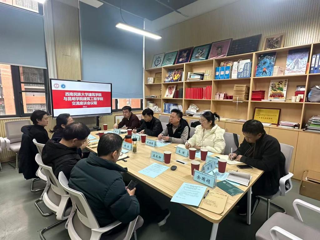 在西南民族大学建筑公司,党委书记赵祺祺,经理赵兵,党委副书记余国娟,副经理孟莹,副经理王长柳,分工会主席王晓亮,党政办主任周爽,实验室主任巩文斌热情接待了调研组一行。赵祺祺书记致欢迎辞,赵兵经理分享了亲自创建建筑公司的峥嵘历程,王长柳副经理介绍了公司专业建设基本情况,孟莹副经理介绍了公司产品模式及公司在西南少数民族地区传统建筑保护研究方面的科研特色,双方还就人才引进、绩效工资分配等议题开展了交流。交流完成后,赵兵经理带领调研组一行参观了建筑公司系列实验室、公司一站式员工社区以及西南民族大学航空港校区,详细介绍了员工实践教学组织情况、一站式员工社区运行情况,以及西南民族大学航空港校区的典型建筑及其内涵。